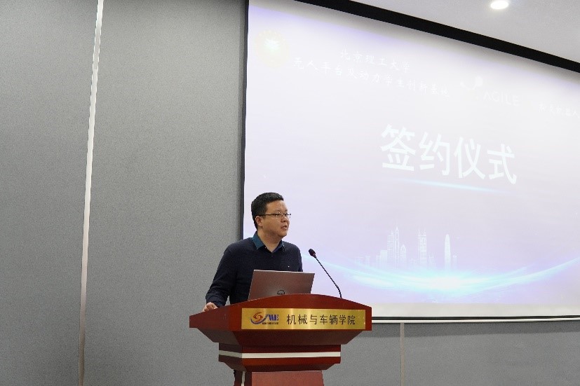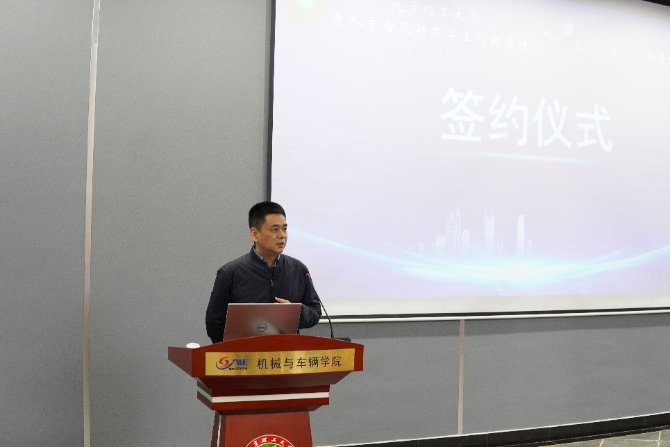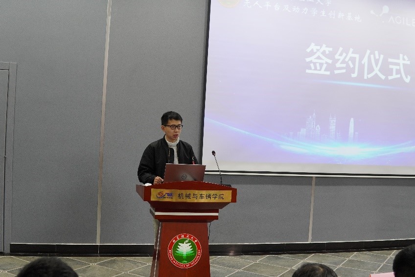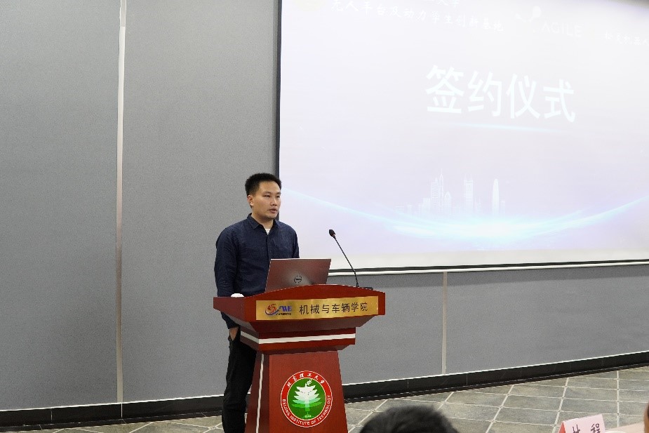 张旭东老师从四个方面介绍了选择松灵机器人作为合作对象的原因,一是松灵机器人的创新创业基因符合无人平台及动力学生创新基地的价值观,二是松灵机器人的产品具有模块化高可靠性的底盘,三是双方之间能够形成开源生态建设,四是松灵机器人具有快速的服务响应和保障,希望双方未来能够深入持久的合作。