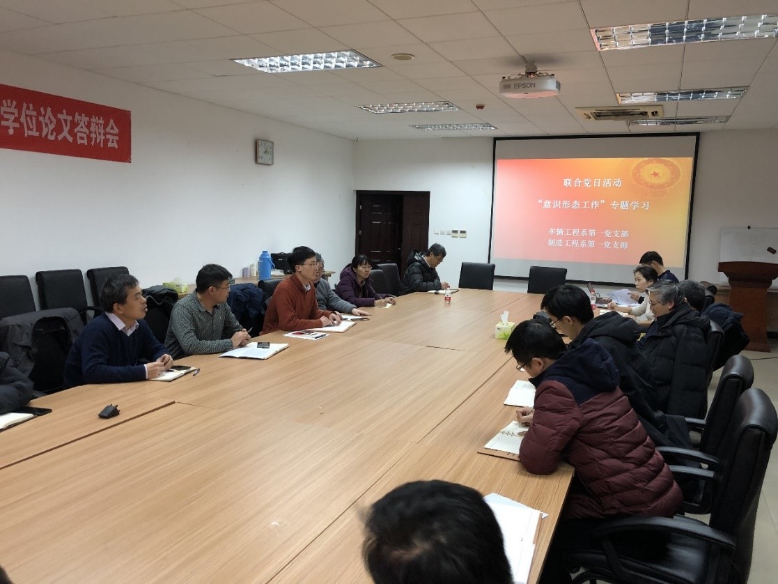 为深入贯彻落实习近平总书记重要指示精神,进一步加强和改进新时期高校意识形态工作在教师基层党支部扎根落实,2019年1月8日下午,ok138太阳集团古天乐车辆工程系第一党支部联合制造工程系第一党支部,在9号教学楼321会议室开展了“意识形态工作”专题学习联合党日活动。
