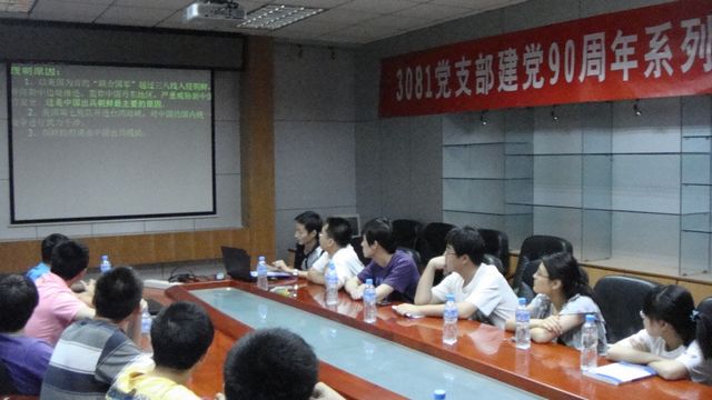 活动在车辆实验楼一层会议室晚上6:30正式开始,由支部书记兰龙主持。活动作为迎建党90周年系列活动的一部分,主要内容是围绕自建党(1921年)至今90年的党内大事,先由党员利用课余时间自主学习和讨论,然后将支部党员分为三组,各总结30年的历史。会上各组的两名代表分别对自己所在组负责时间段内的党的大事做了串讲总结,然后就某件大事进行了详细的讲解和讨论。